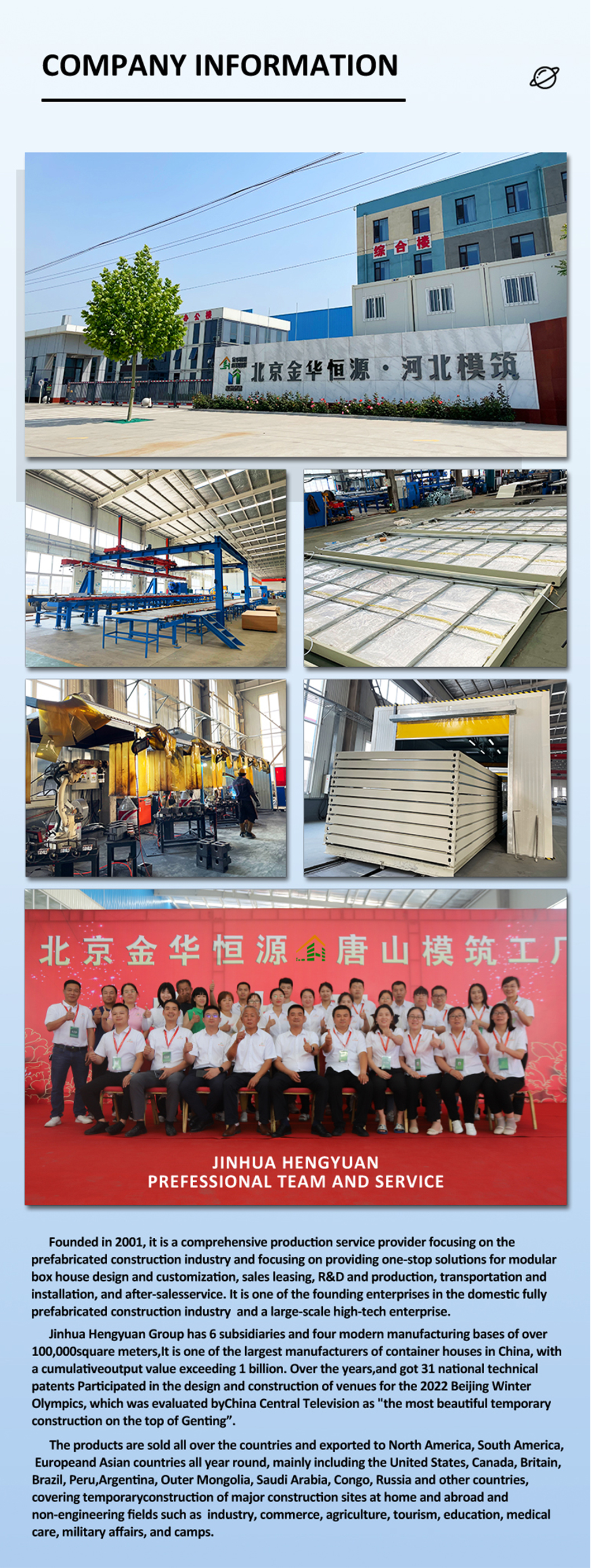 Jinhua Hengyuan Group memiliki 6 anak perusahaan dan empat basis manufaktur modern seluas lebih dari 60.000 meter persegi. Perusahaan ini merupakan salah satu produsen rumah kontainer terbesar di Tiongkok, dengan nilai produksi kumulatif melebihi 1 miliar. Selama bertahun-tahun, perusahaan ini telah memperoleh 31 paten teknis nasional dan berpartisipasi dalam desain dan konstruksi lokasi Olimpiade Musim Dingin Beijing 2022, yang dinilai oleh China Central Television sebagai "konstruksi sementara terindah di puncak Genting".